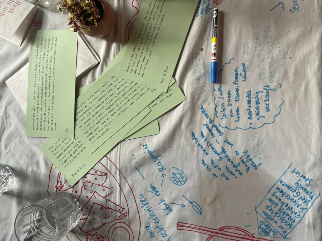 Hast du schon gegessen? möchte die vietnamesische Küche im Zusammenhang von Kolonial- und Migrationsgeschichten sichtbar machen und entstigmatisieren, indem bestehende Narrative, die die Küchen betreffen und unsere Sichtweise auf Esskultur prägen, dekonstruiert werden. Das Projekt trägt dazu bei, Empowerment für eine selbstbestimmte Esskultur zu fördern, indem individuelle Erfahrungen in der Diaspora in einer kollektiven und von der Community selbstbestimmten Wissenssammlung umgesetzt werden. Über das Sprechen über Essen soll zudem ein Wissenstransfer zwischen den Generationen, der durch Sprachbarrieren und transgenerationale Traumata geprägt sein kann, angestrebt werden.