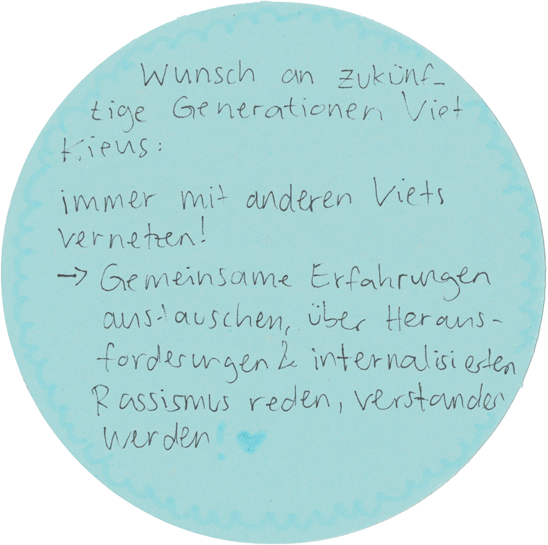 Ich finde es genauso wichtig, einfach nur Community Care zu betreiben und zu schauen, was die Narrative sind, was die Punkte sind, die uns guttun. Denn ich denke, wenn man Vorwissen hat, spricht man immer mit einer anderen Selbstverständlichkeit über die Themen. Und wenn wir untereinander, also việt-deutsche Menschen, miteinander sprechen, dann ist das doch auch schön. Das schafft vielleicht einen anderen Raum der Selbstverständlichkeit, als wenn man immer mit dem Akt der Wissensvermittlung an Außenstehende herangehen muss.